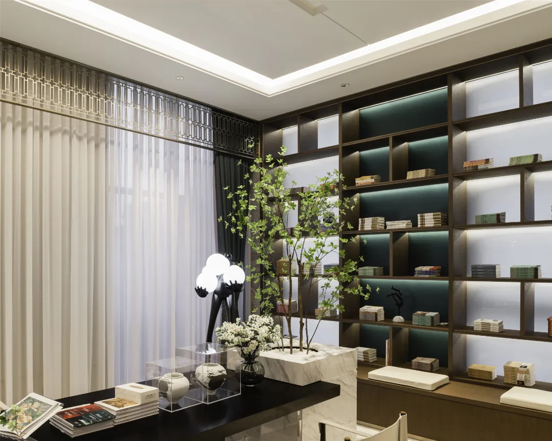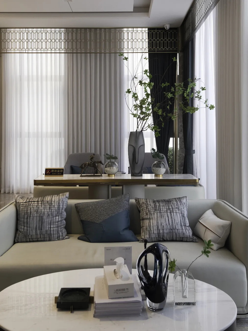 該項目設計為新中式現(xiàn)代風格,將中式元素與現(xiàn)代材質巧妙兼柔進行布置,總體布局上對稱均衡,端正穩(wěn)健,在裝飾細節(jié)上富于變化,充分體現(xiàn)出中國傳統(tǒng)美學精神。整體空間簡潔大方,相得益彰。