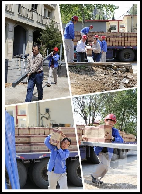 地面鋪裝的磚到現(xiàn)場,一箱80多斤,一共700多件。裝修工們二話不說,甩開膀子全部行動(dòng),熱火朝天的搬了起來!