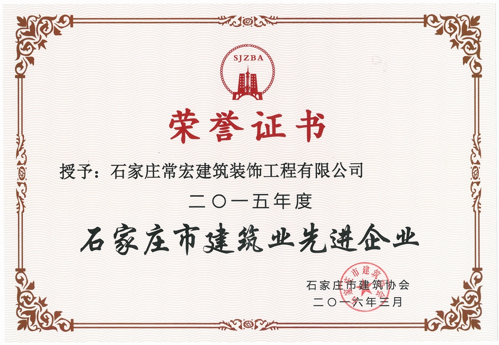 常宏建筑裝飾工程有限公司憑借夯實(shí)的專業(yè)技術(shù)、良好的信譽(yù)、完善的服務(wù),得到大眾及專家領(lǐng)導(dǎo)的信任及肯定,榮獲2015年度石家莊市建筑業(yè)先進(jìn)企業(yè)以及2014-2015年度石家莊市建筑業(yè)誠(chéng)信企業(yè)。