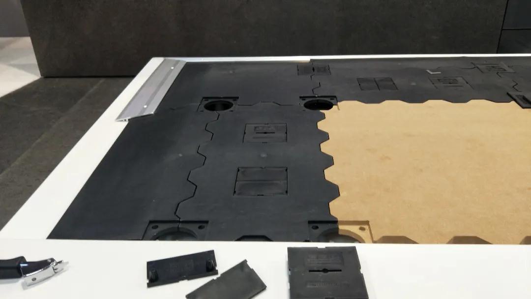 地面架空模塊。支座的調(diào)平可以在鋪設(shè)完基層板后進(jìn)行,底部空腔走線,頂部可以做地毯、地膠、地板等飾面。