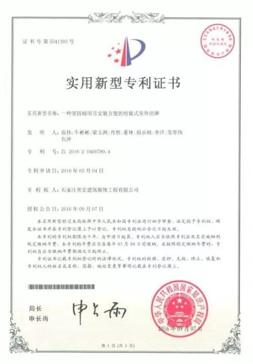 近日,常宏建筑裝飾工程有限公司榮獲由中華人民共和國國家知識產權局頒發(fā)的2項實用新型專利證書。分別為:一種弧型廣告牌,專利號為:ZL 2016 2 0189323.4,專利權期限為十年;一種堅固耐用且安裝方便的組裝式室外招牌,專利號為:ZL 2016 2 0400789.4. 專利權期限為十年。在此我們表示熱烈的祝賀。
